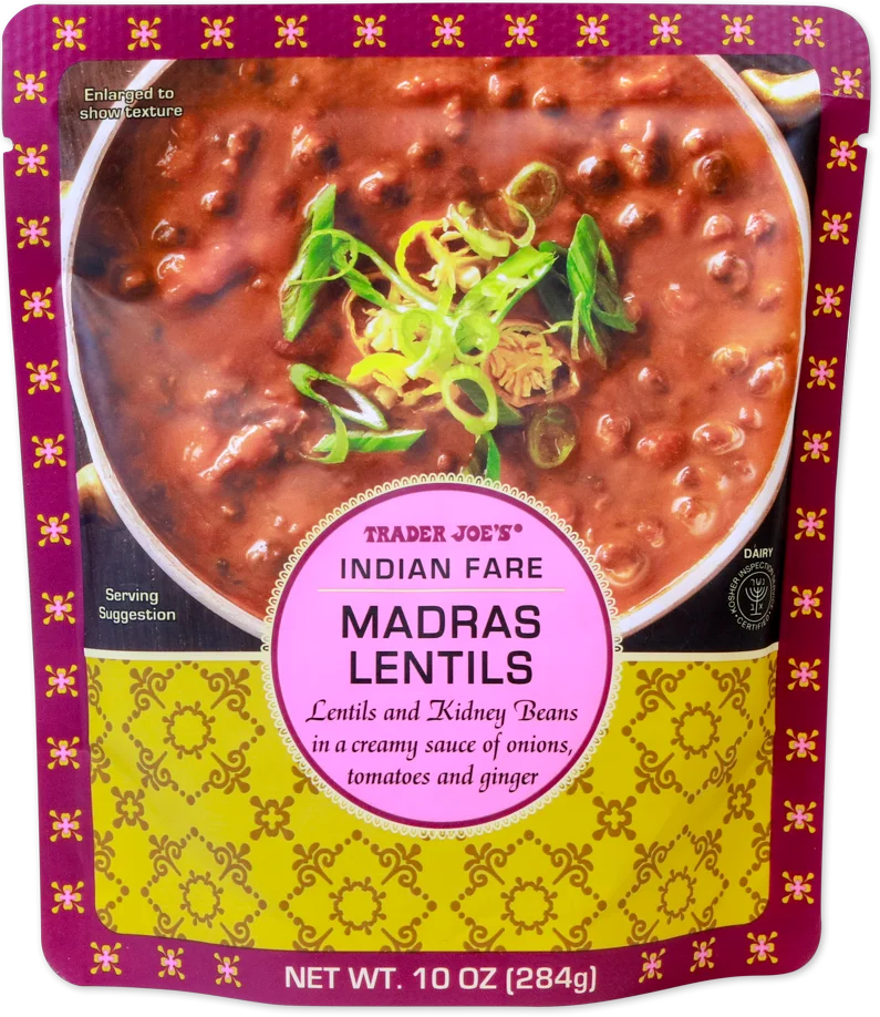 Drawing inspiration from the wide and complex flavours of Indian cuisine, TJ's Indian Fare meals offer a quick, convenient way to bring curry dishes to your table in a matter of minutes. In the case of TJ's Madras Lentils, TJ's supplier in India combines hearty lentils and kidney beans in a well-seasoned, buttery tomato sauce, flavoured with savory cumin and bits of onion and ginger. They then place that in a pouch that can be boiled, in-bag, for five minutes, or microwaved for one minute, and served in an instant.