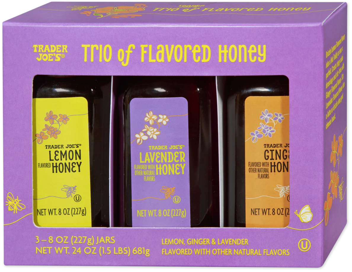 Seasonal! Among honey’s many winning attributes, there’s one that doesn’t quite get the attention it deserves: the way it can successfully carry other flavours that complement its natural sweetness. It’s a quality that’s showcased not once, not twice, but in triumphant triplicate in TJ's Trio of Flavoured Honey. Available only during the holiday season, each package contains three, 227-gram jars of wildflower Honey, naturally flavoured in three distinct styles: one with bright and bracingly tart Lemon, one with zesty and delicately spicy Ginger, and another with floral and delightfully aromatic Lavender.